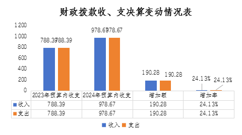 2024年度收、支總計均為978.67萬元。與2023年度相比,2024年度預算收入978.67萬元,比上年預算收入788.39萬元增加190.28萬元,增加24.13%,收入增加的主要原因是:財政追加“巴適購”電商平臺建設補助、革命老區(qū)重點城市對口合作(金華-巴中)等企業(yè)發(fā)展資金項目;增人增資及社會保障繳費預算收入總數(shù)增加等。