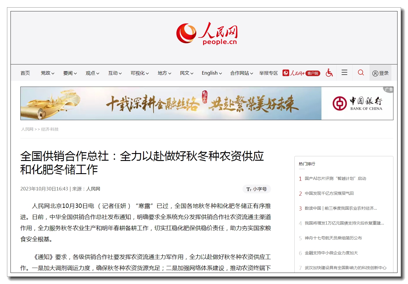 “寒露”已過,全國各地秋冬種和化肥冬儲正有序推進(jìn)。日前,中華全國供銷合作總社發(fā)布通知,明確要求全系統(tǒng)充分發(fā)揮供銷合作社農(nóng)資流通主渠道作用,全力服務(wù)秋冬農(nóng)業(yè)生產(chǎn)和明年春耕備耕工作,切實(shí)扛穩(wěn)化肥保供穩(wěn)價責(zé)任,助力夯實(shí)國家糧食安全根基。
