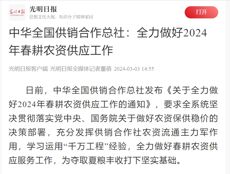 日前,中華全國供銷合作總社發(fā)布《關(guān)于全力做好2024年春耕農(nóng)資供應(yīng)工作的通知》,要求全系統(tǒng)堅決貫徹落實黨中央、國務(wù)院關(guān)于做好農(nóng)資保供穩(wěn)價的決策部署,充分發(fā)揮供銷合作社農(nóng)資流通主力軍作用,學(xué)習(xí)運用“千萬工程”經(jīng)驗,全力做好春耕農(nóng)資供應(yīng)服務(wù)工作,為奪取夏糧豐收打下堅實基礎(chǔ)。